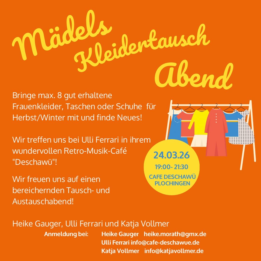 Startseite > News & Events > Mädels Kleidertauschabend am Di, 24.03.26 | 19:00-21:30 Uhr Mädels Kleidertauschabend am Di, 24.03.26 | 19:00-21:30 Uhr